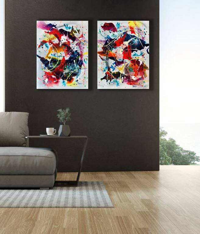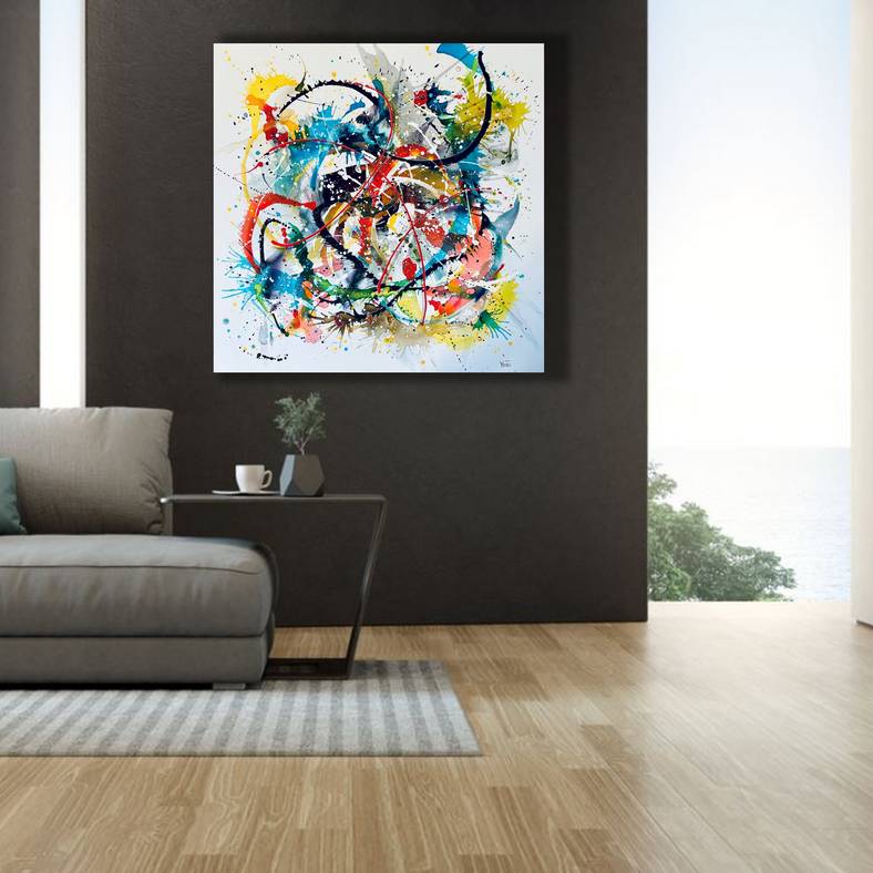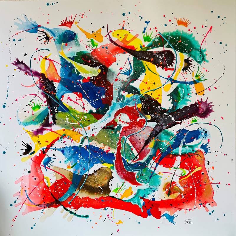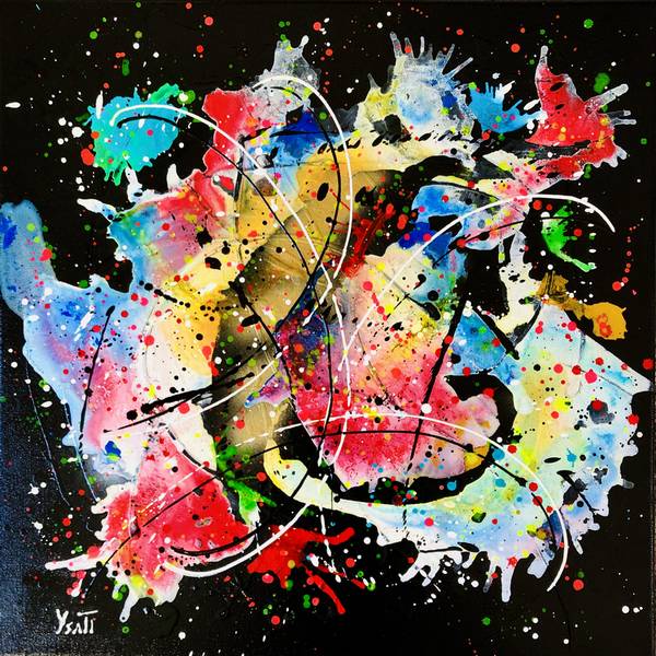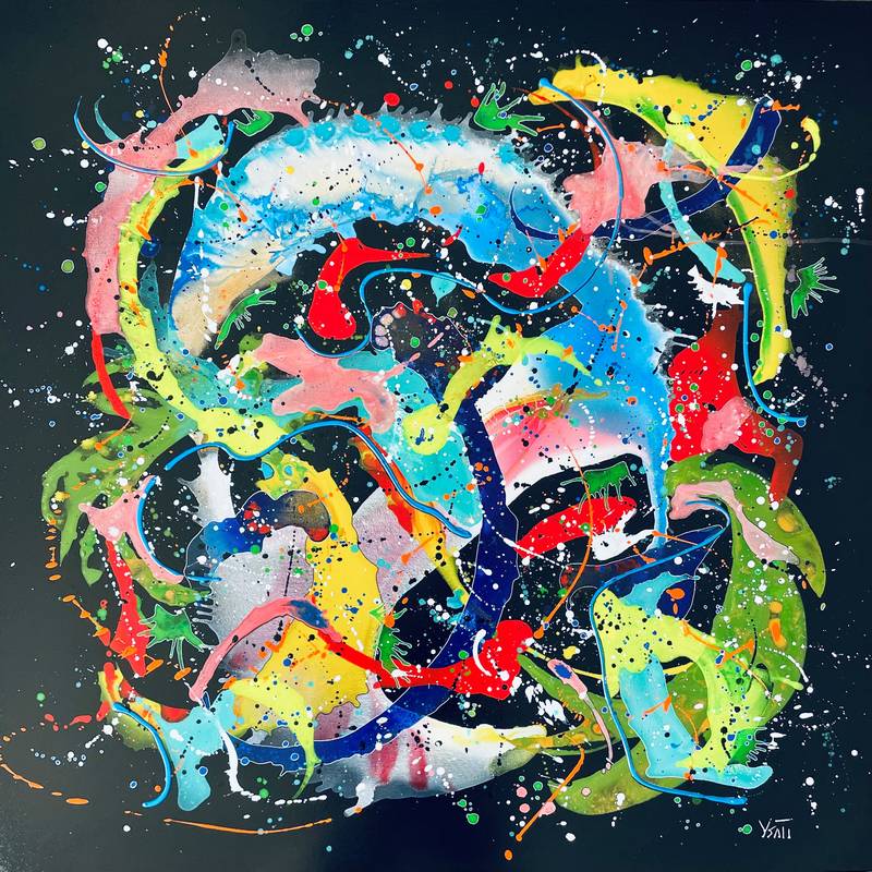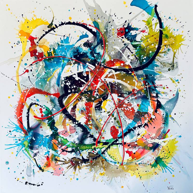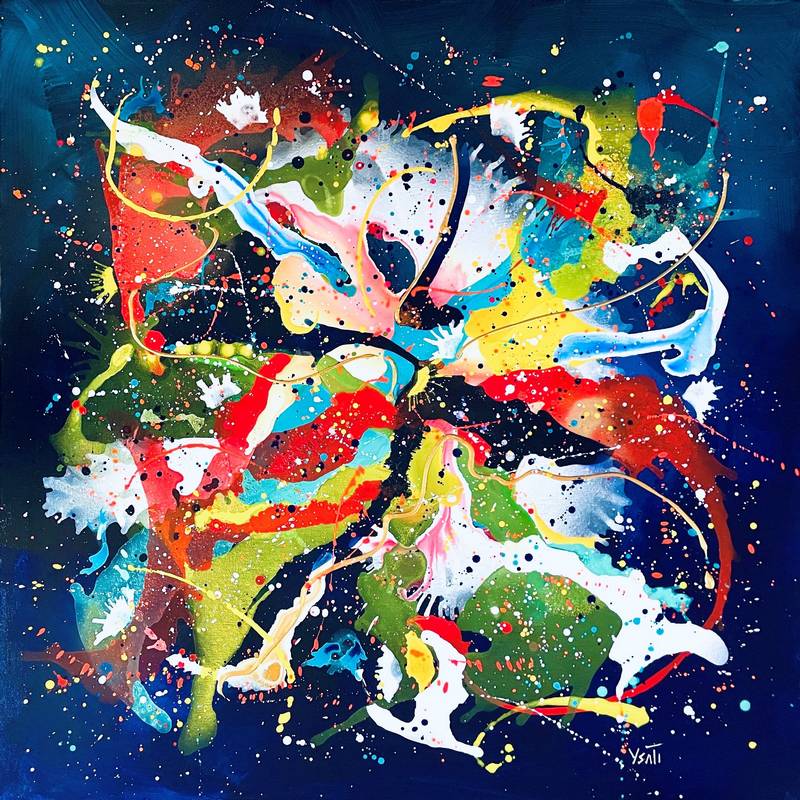 Je crée de façon impulsive et libre avec des éclaboussures, des gouttes et des jets de peinture. L’objectif étant d’associer le mouvement avec le sentiment d’apesanteur.